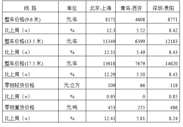 表1 本周部分線路平均價格及環(huán)比情況對比