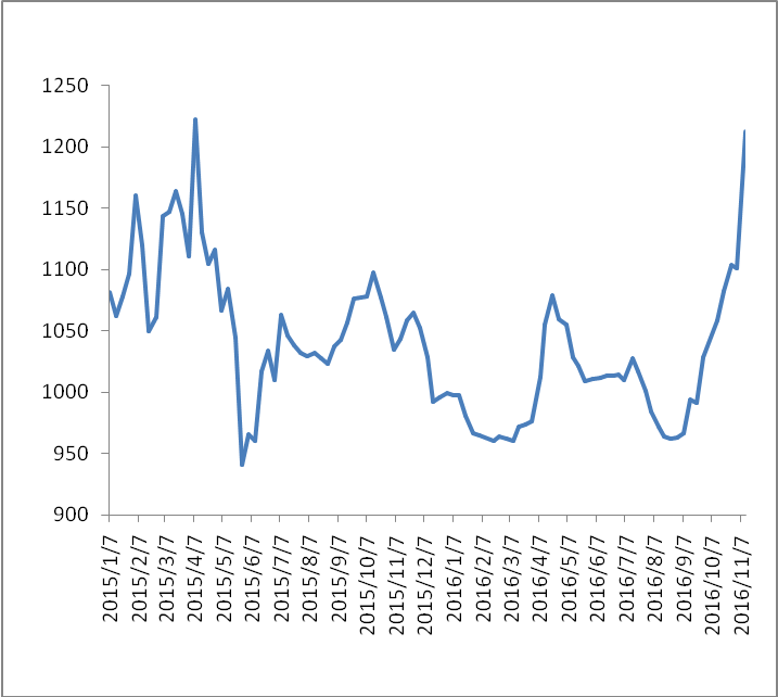 本周(2016年11月7日~11月11日),中國公路物流運價指數(shù)1212.8點,在上周小幅回調(diào)后明顯回升,比上周回升10.1%。