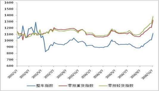 本周,隨著冬季及“雙十一”到來,大宗商品及快消品市場需求增長明顯,廠商儲備的貨源也較為充足,公路物流市場需求較為旺盛,公路物流價格指數(shù)回升較為明顯,達到年內(nèi)較高水平。隨著“雙十一”電商促銷活動來臨,公路運輸市場需求短期仍將保持較高水平,未來兩周公路物流運價指數(shù)總體將延續(xù)回升走勢。