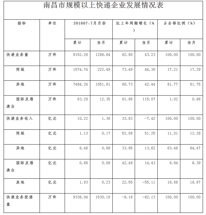 7月份,南昌市快遞服務(wù)企業(yè)業(yè)務(wù)量累計(jì)完成9152.26萬件,同比增長62.80%;業(yè)務(wù)收入累計(jì)完成10.22億元,同比增長33.83%。其中,同城業(yè)務(wù)收入累計(jì)完成1.13億元,同比增長52.08%;異地業(yè)務(wù)收入累計(jì)完成6.48億元,同比增長33.85%;國際及港澳臺(tái)業(yè)務(wù)收入累計(jì)完成0.68億元,同比增長42.49%。
