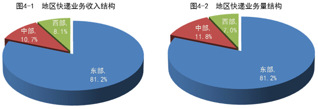 1-7月份,東、中、西部地區(qū)快遞業(yè)務(wù)收入的比重分別為81.2%、10.7%和8.1%,業(yè)務(wù)量比重分別為81.2%、11.8%和7.0%。與去年同期相比,東部地區(qū)快遞業(yè)務(wù)收入比重下降了0.5個(gè)百分點(diǎn),快遞業(yè)務(wù)量比重下降了0.4個(gè)百分點(diǎn);中部地區(qū)快遞業(yè)務(wù)收入比重上升了0.3個(gè)百分點(diǎn),快遞業(yè)務(wù)量比重上升了0.4個(gè)百分點(diǎn);西部地區(qū)快遞業(yè)務(wù)收入比重上升了0.2個(gè)百分點(diǎn),快遞業(yè)務(wù)量比重持平。