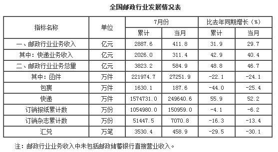 1-7月份,郵政行業(yè)業(yè)務(wù)收入(不包括郵政儲(chǔ)蓄銀行直接營(yíng)業(yè)收入)累計(jì)完成2887.6億元,同比增長(zhǎng)31.9%;業(yè)務(wù)總量累計(jì)完成3823.2億元,同比增長(zhǎng)48.8%。
