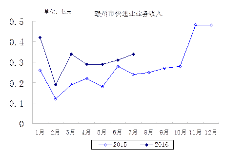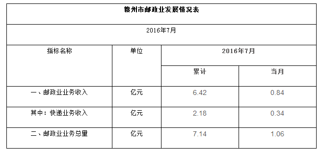 2016年7月,贛州市郵政企業(yè)和快遞服務(wù)企業(yè)業(yè)務(wù)收入(不包括郵政儲蓄銀行直接營業(yè)收入)0.84億元,本年累計完成6.42億元;業(yè)務(wù)總量1.06億元,本年累計完成7.14億元。