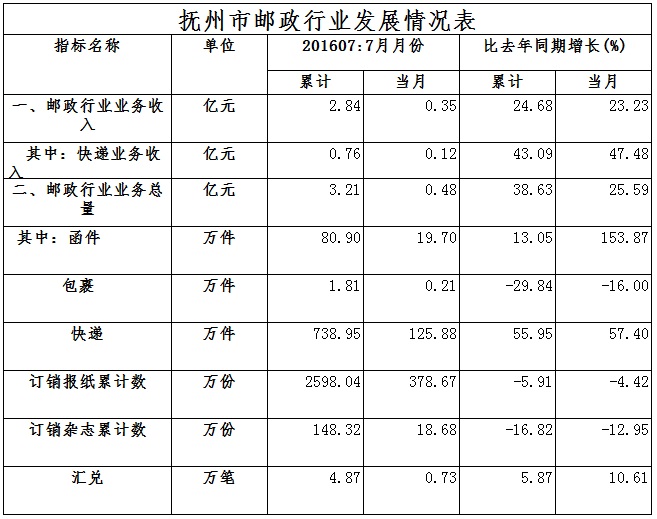 2016年1-7月,撫州市郵政企業(yè)和規(guī)模以上快遞服務(wù)企業(yè)業(yè)務(wù)收入(不包括郵政儲蓄銀行直接營業(yè)收入)累計2.84億元,同比增長24.68%;業(yè)務(wù)總量3.21億元,同比增長38.63%。