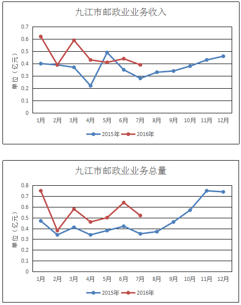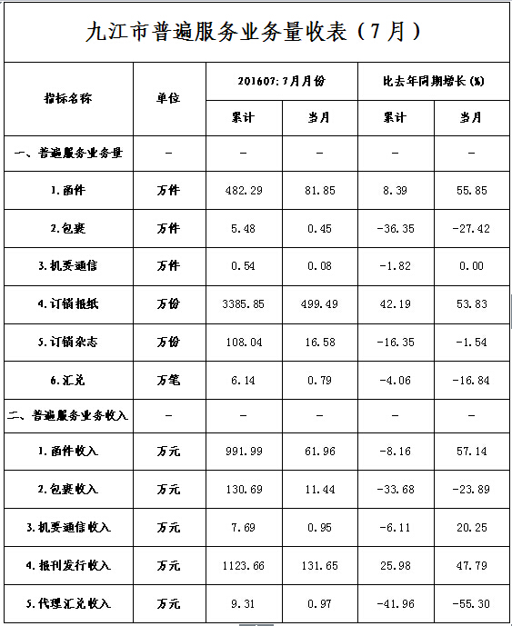 2016年7月,九江市郵政業(yè)業(yè)務(wù)收入完成(不包括郵政儲蓄銀行直接營業(yè)收入)0.39億元,本年累計完成3.27億元,同比增長31.22%;業(yè)務(wù)總量完成0.52億元,本年累計完成3.83億元,同比增長41.65%。