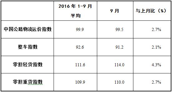 表1 2016年9月中國公路物流運(yùn)價(jià)指數(shù)表