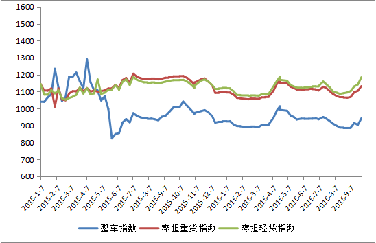 中國公路物流運(yùn)價(jià)指數(shù)2016年9月為99.5點(diǎn),比上月回升2.7%。本月運(yùn)價(jià)指數(shù)環(huán)比回升,一方面是受到公路物流市場逐漸步入傳統(tǒng)旺季,需求回升所致;另一方面,受到治超新政實(shí)施等因素影響,運(yùn)輸費(fèi)用有所上漲,帶動(dòng)價(jià)格指數(shù)回升。從各周情況看,月內(nèi)除第三周小幅回調(diào)外,其它各周均呈現(xiàn)“加快回升”的走勢。