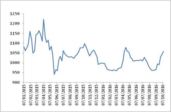 圖 1 2015-2016年各周中國公路物流運價指數(shù)