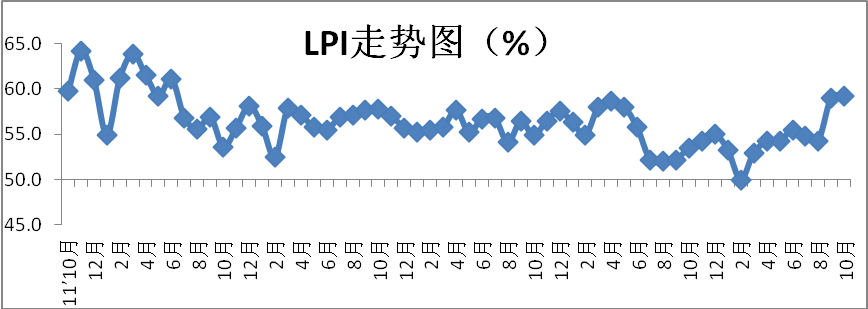 固定資產(chǎn)投資完成額指數(shù)回升,物流基礎(chǔ)設(shè)施趨于改善。10月份,固定資產(chǎn)投資完成額指數(shù)為52.6%,回升2.3個百分點,反映出物流運行的基礎(chǔ)設(shè)施條件有所改善。