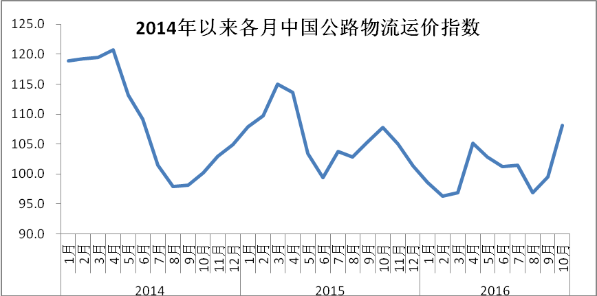 中國物流與采購聯(lián)合會發(fā)布的2016年10月份中國物流業(yè)景氣指數(shù)為59.2%較上月回升0.2個百分點;中國倉儲指數(shù)為50.7%,較上月回升0.1個百分點;中國公路物流運價指數(shù)為108.1點,比上月回升8.7%。