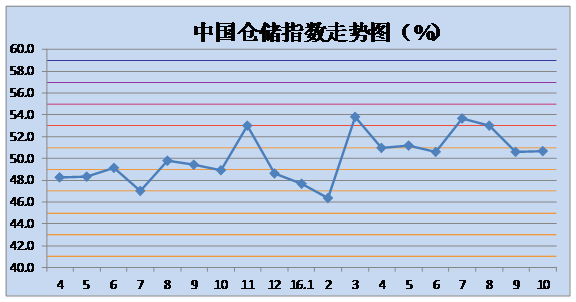 中國物流與采購聯(lián)合會與中儲發(fā)展股份有限公司聯(lián)合調(diào)查的2016年10月中國倉儲指數(shù)為50.7%,較上月回升0.1個百分點(diǎn),連續(xù)八個月位于擴(kuò)張區(qū)間。各分項指數(shù)中,設(shè)施利用率指數(shù)、主營業(yè)務(wù)成本指數(shù)、期末庫存指數(shù)及企業(yè)員工指數(shù)較上月有所回升,其余指數(shù)均有不同程度的回落。