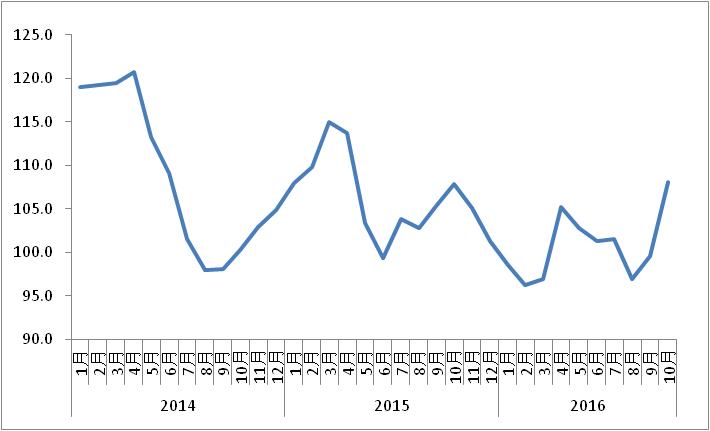 中國(guó)公路物流運(yùn)價(jià)指數(shù)2016年10月為108.1點(diǎn),比上月回升8.7%,回升幅度為年內(nèi)的最高。運(yùn)價(jià)指數(shù)連續(xù)兩個(gè)月環(huán)比回升,且回升幅度比上年同期擴(kuò)大5個(gè)百分點(diǎn)。這也顯示出,本月運(yùn)價(jià)指數(shù)的回升一方面是受到公路物流市場(chǎng)傳統(tǒng)旺季來(lái)臨,“雙十一”將近備貨需求明顯回升等因素影響;另一方面,也是受到治超新政推進(jìn)、市場(chǎng)運(yùn)力結(jié)構(gòu)調(diào)整等因素影響,運(yùn)輸費(fèi)用水平有所上漲,帶動(dòng)價(jià)格指數(shù)回升。從各周情況看,月內(nèi)各周均有所回升,各周呈現(xiàn)“連續(xù)性上漲,幅度有所回調(diào)”的態(tài)勢(shì)。