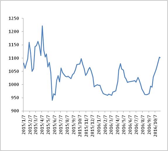 圖 1 2015-2016年各周中國公路物流運(yùn)價(jià)指數(shù)