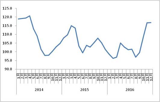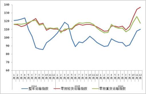 由中國物流與采購聯(lián)合會和林安物流集團聯(lián)合調查的中國公路物流運價指數(shù)2016年12月為116.8點,比上月回升0.06%,運價指數(shù)連續(xù)四個月環(huán)比回升,比上年同期增長15.3%,全年總體高于去年同期水平。9月份以來,受到治超新政實施等因素影響,運輸費用持續(xù)上漲,加之物流需求穩(wěn)中有升,多重因素共同影響,帶動價格指數(shù)連續(xù)回升。
