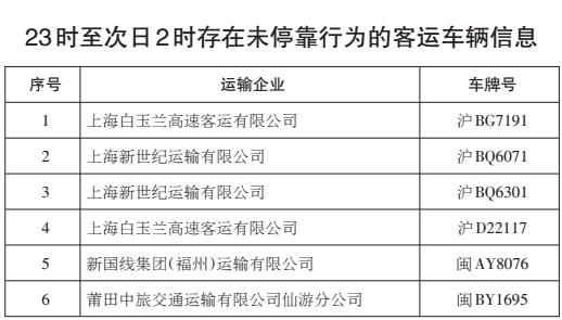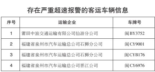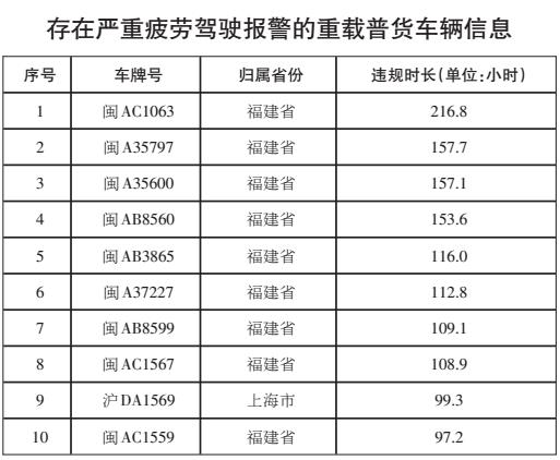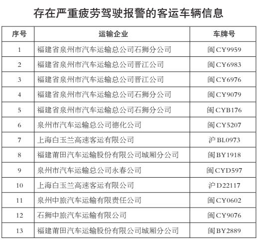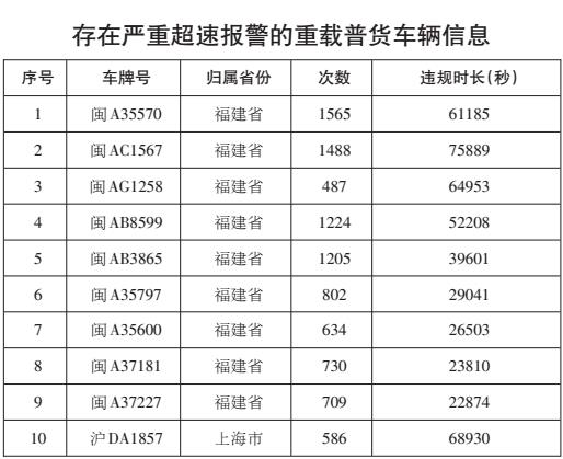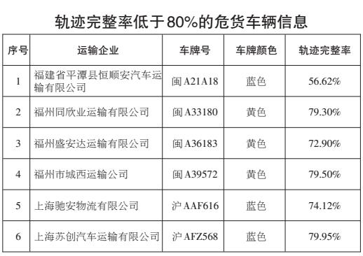 上海、福建兩?。ㄊ校?輛客車(chē)、7輛危貨車(chē)輛、10輛重載普貨車(chē)輛車(chē)載終端存在嚴(yán)重的超速報(bào)警,涉嫌違規(guī)超速行駛;13輛客車(chē)、10輛重載普貨車(chē)輛系統(tǒng)平臺(tái)存在較嚴(yán)重的疲勞駕駛報(bào)警,涉嫌違規(guī)疲勞駕駛;6輛客車(chē)23時(shí)至次日2時(shí)存在未??啃袨?,涉嫌違反接駁運(yùn)輸管理規(guī)定;6輛危貨車(chē)輛軌跡完整率低于80%。