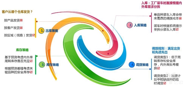 規(guī)劃了外倉(cāng)庫(kù)容問(wèn)題后,緊接著就是物流計(jì)劃策略的制定與調(diào)整,包括出庫(kù)策略、入庫(kù)策略、庫(kù)存策略和調(diào)撥策略,以解決內(nèi)倉(cāng)和外倉(cāng)之間的庫(kù)存存儲(chǔ)與調(diào)撥、訂單分配、庫(kù)存管理、產(chǎn)品貨期混亂不滿足先進(jìn)先出,內(nèi)部調(diào)撥成本和操作成本等問(wèn)題。