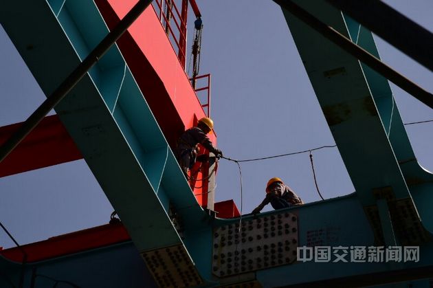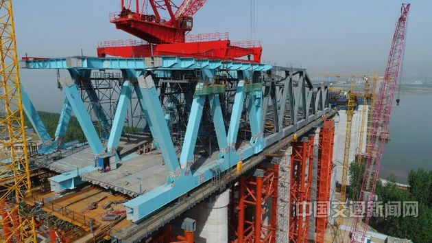 蒙華鐵路三門峽黃河公鐵兩用大橋全長5663.75米,由中國鐵建大橋局承建,北起山西省運城市,南至河南省三門峽市,橫跨黃河,連接山西、河南兩個省區(qū),是蒙華鐵路全線控制性工程。主橋承載著四線鐵路和六車道高速公路,梁部為連續(xù)鋼桁梁,采用頂推法施工。頂推總長度1142.5米,頂推總重量近4.3萬噸,相當于2萬臺普通轎車同時行駛在大橋上,設計活載473米/千牛,其頂推長度、重量均居世界首位。